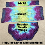 Our regular bendie wings are 100% Habotai Silk with a light weight and smooth touch. This fabric is what people often call “China silk.” They are approximately 35×55” each, 8mm weight, and have a serged edge. A color-coordinated grosgrain ribbon has been sewn on that houses the flexible bendie rods.